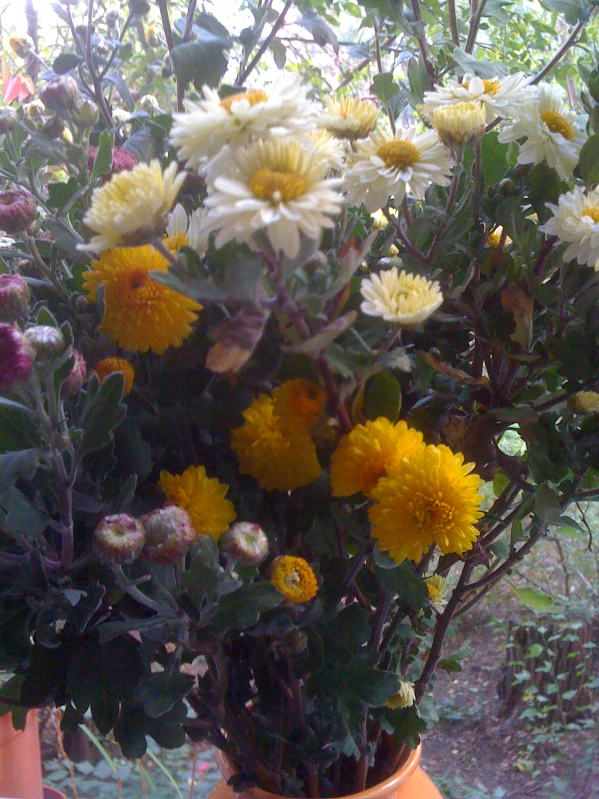 Le-am primit duminica, 12 Octombrie 2014. Sunt adunate din gradina si aduse de sotul meu, care de fiecare data reuseste sa-i „scandalizeze” pe vecinii nostri de sex masculin! Ei vocifereaza evident, de cate ori (destul de des) il vad aducandu-mi flori! Dar noua ne pasa mai putin de reactiile lor! 🙂