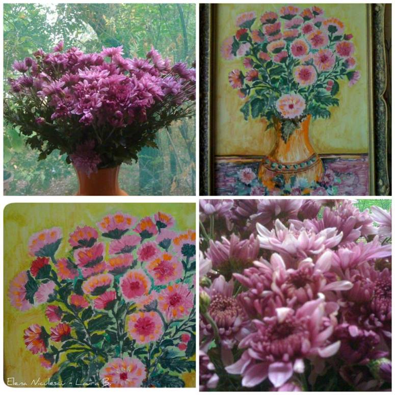 Colaje cu flori si picturile mele realizate in perioada 2011-2016 » colaj cu crizanteme roz si tablou